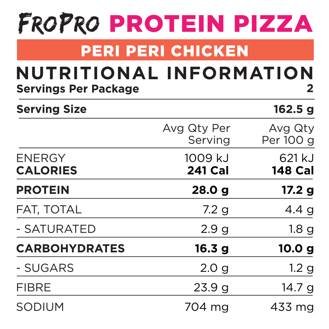 Topped with delicious Peri Peri Seasoned Australian Chicken Breast, Red Onions, Reduced Fat Mozzarella Cheese, and Rocket on our high protein Pizza Base.